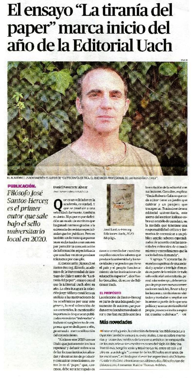 El ensayo "La tiranía del paper" marca inicio del año de la Editorial Uach [artículo] Daniel Navarrete Alvear.