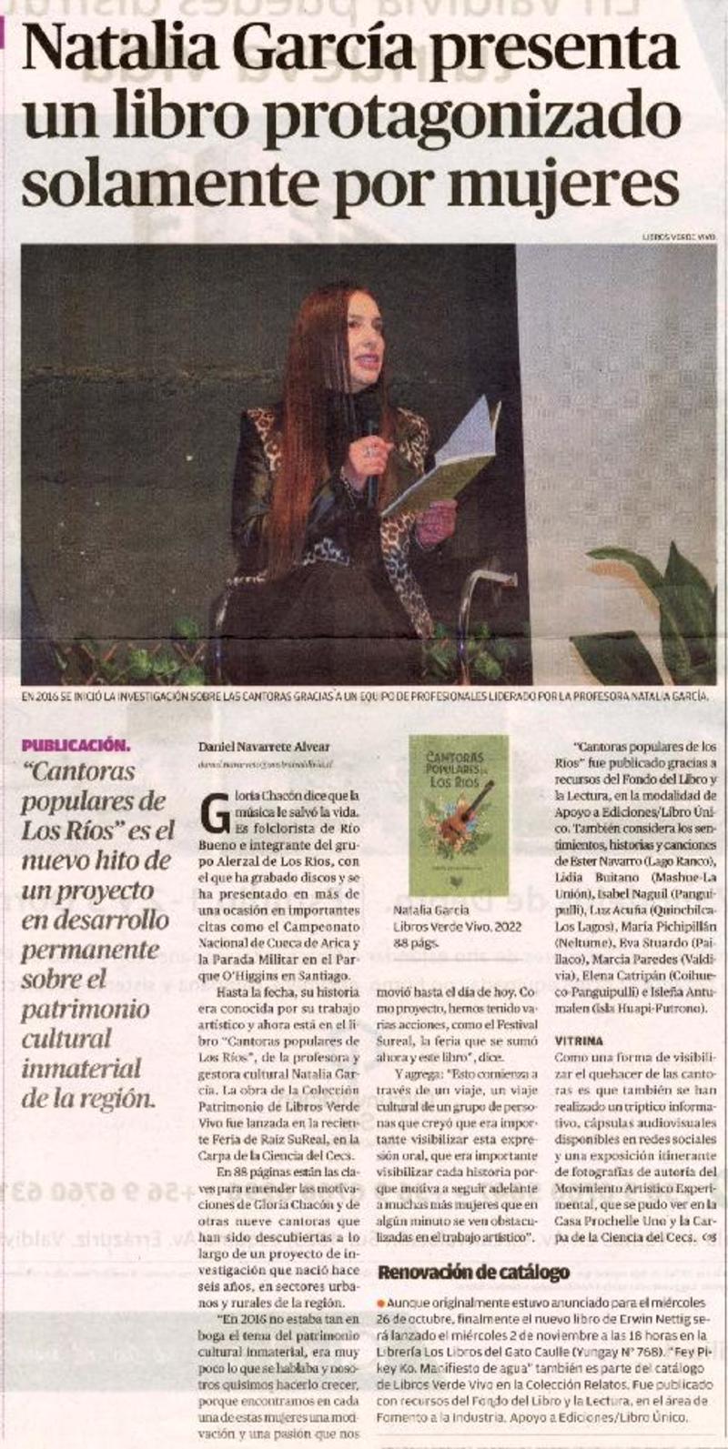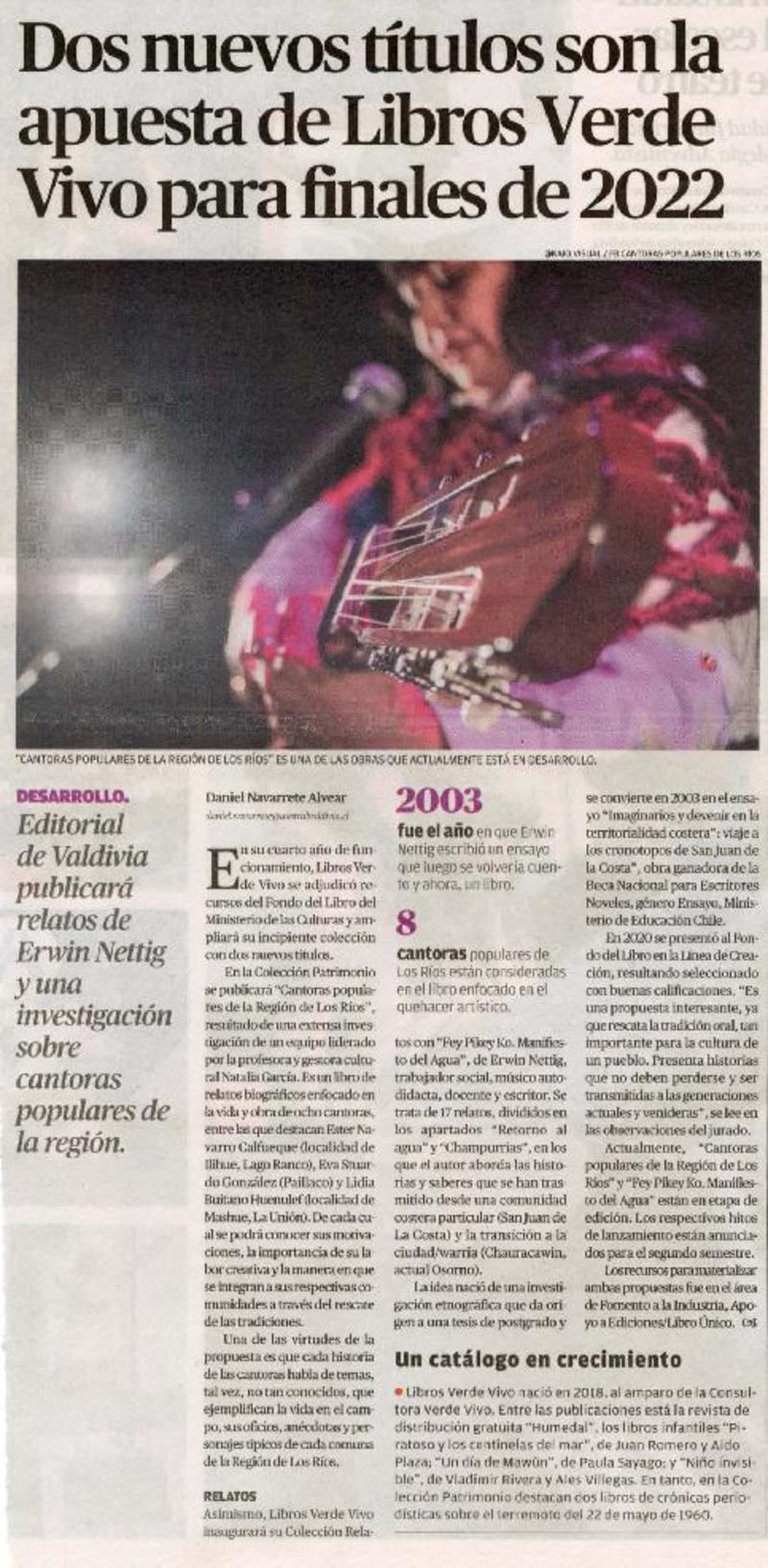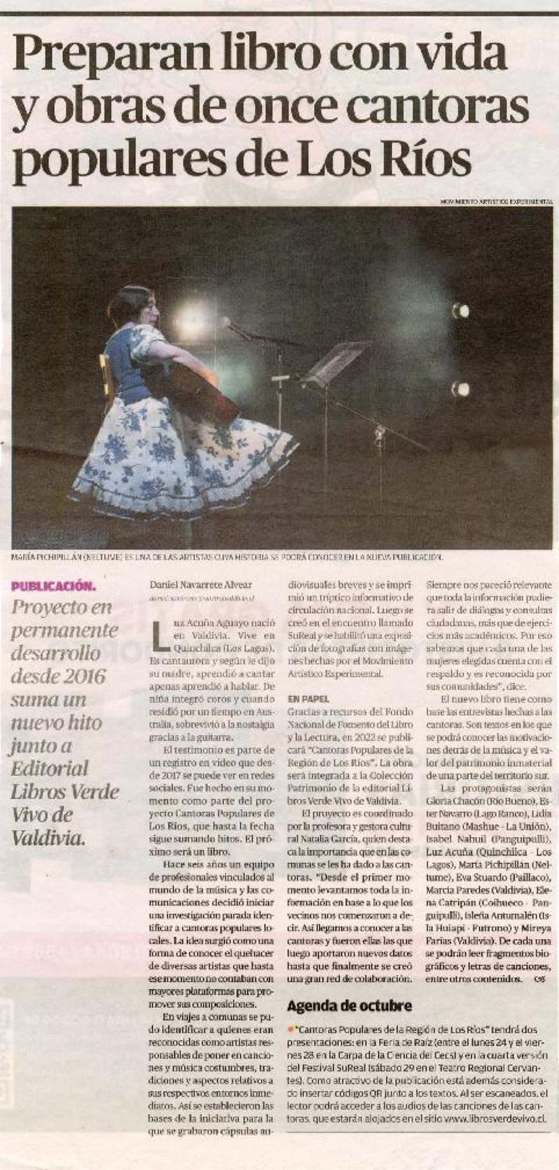 Preparan libro con vida y obras de once cantoras populares de Los Ríos [artículo] Daniel Navarrete Alvear.