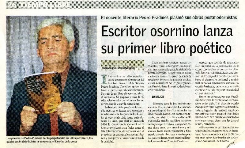 Escritor osornino lanza su primer libro poético [artículo] Carolina Gatica Vargas.