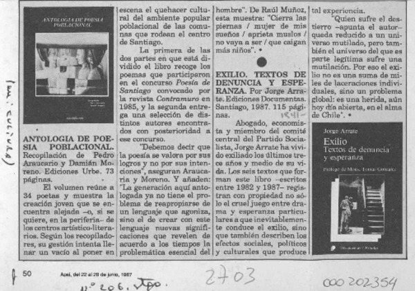 ARAUCARIO, PEDRO - Arrate, Jorge - ANTOLOGIA DE POESIA POBLACIONAL - Exilio, textos de denuncia y esperanza - MORENO, DEMIAN