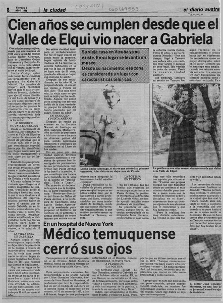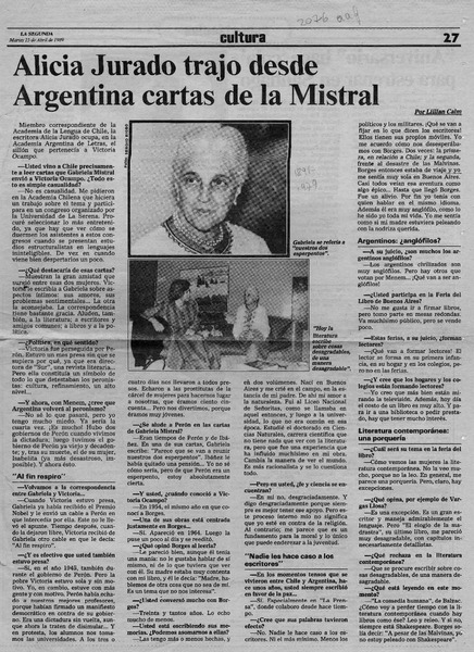 Alicia Jurado trajo desde Argentina cartas de la Mistral [artículo] Lillian Calm.
