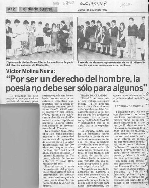 Víctor Molina Neira, "Por ser un derecho del hombre, la poesía no debe ser sólo para algunos" [artículo].