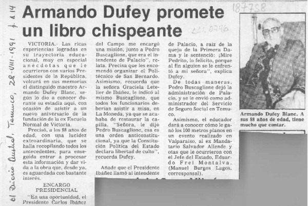 Armando Dufey promete un libro chispeante [artículo] Manuel Burgos Lagos.