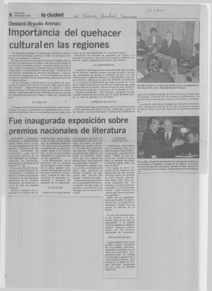 Braulio Arenas inaugura hoy una muestra sobre premios nacionales [artículo].