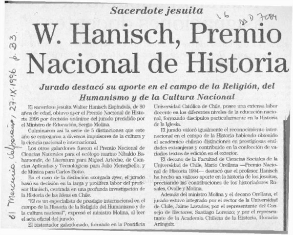 W. Hanisch, Premio Nacional de Historia [artículo].
