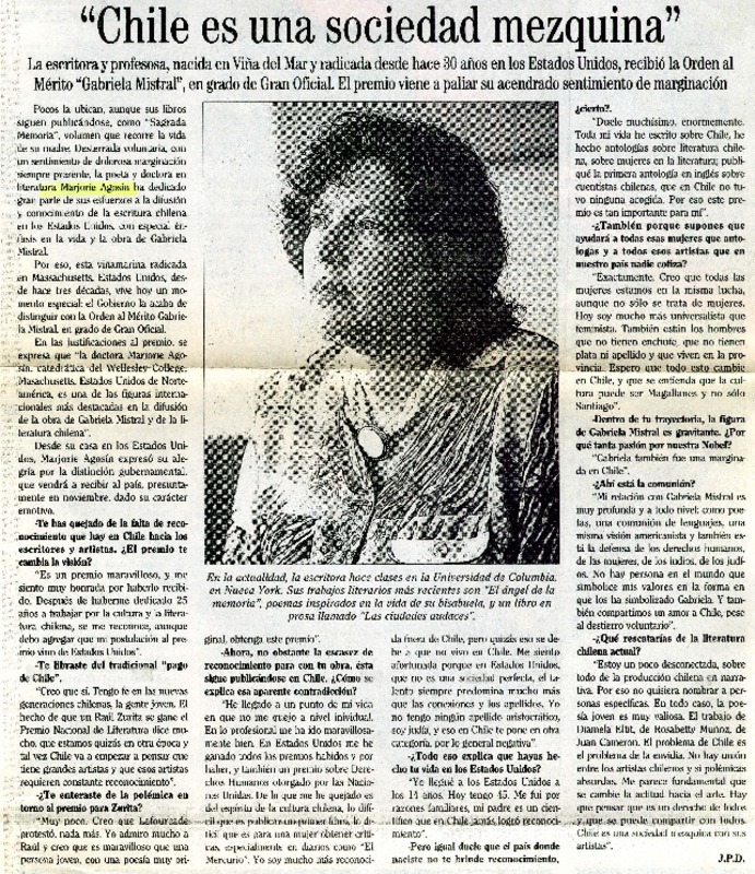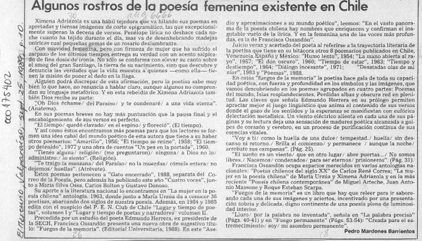 Algunos rostros de la poesía femenina existente en Chile [artículo] Pedro Mardones Barrientos.