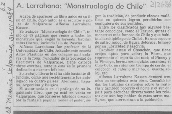 A. Larrahona, "Monstruología de Chile" [artículo].