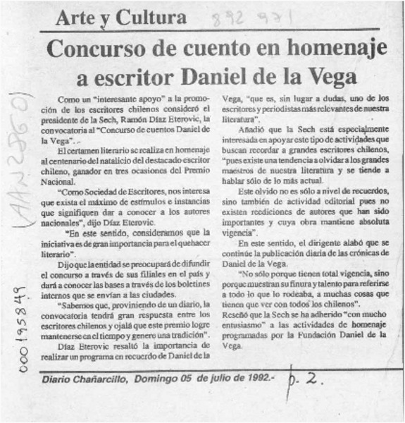 Concurso de cuento en homenaje a escritor Daniel de la Vega [artículo].