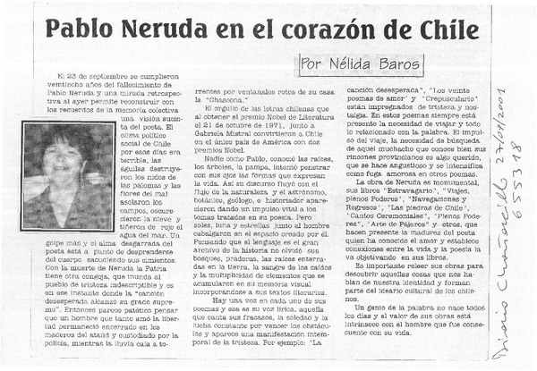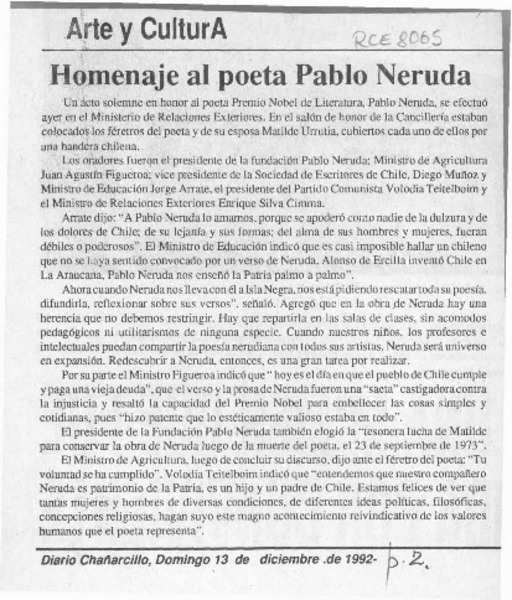 Recuerdo mundial de Neruda al conmemorarse su muerte [artículo].