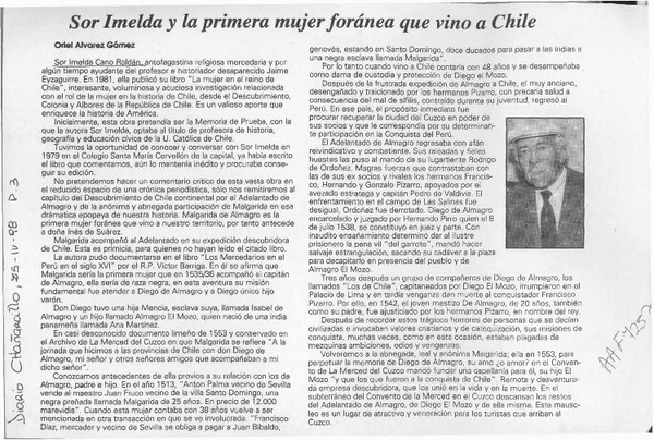 Sor Imelda y la primera mujer foránea que vino a Chile [artículo] Oriel Alvarez Gómez.