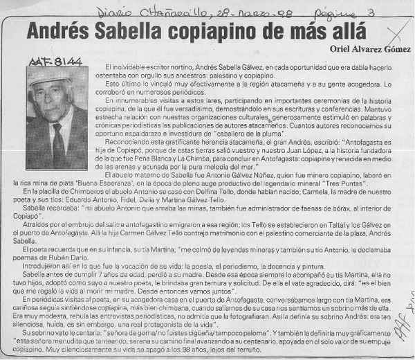 Andrés Sabella copiapino de más allá [artículo] Oriel Alvarez G.