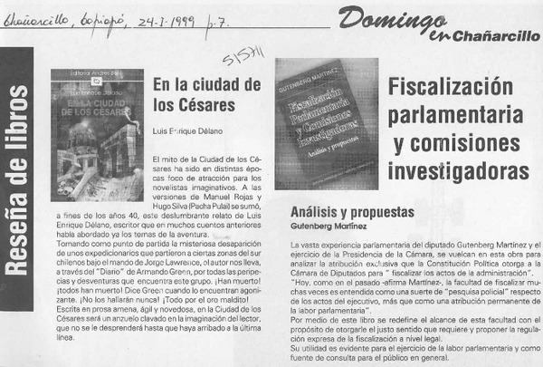 Autores chilenos - DELANO, LUIS ENRIQUE - EN LA CIUDAD DE LOS CESARES - MARTINEZ, GUTENBERG - FISCALIZACION PARLAMENTARIA Y COMISIONES INVESTIGADORES