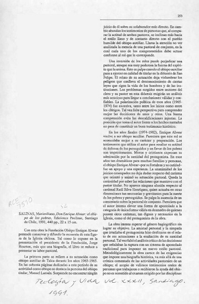 Salinas, Maximiliano, "Don Enrique Alvear, el obispo de los pobres" [artículo] M. Barrios.