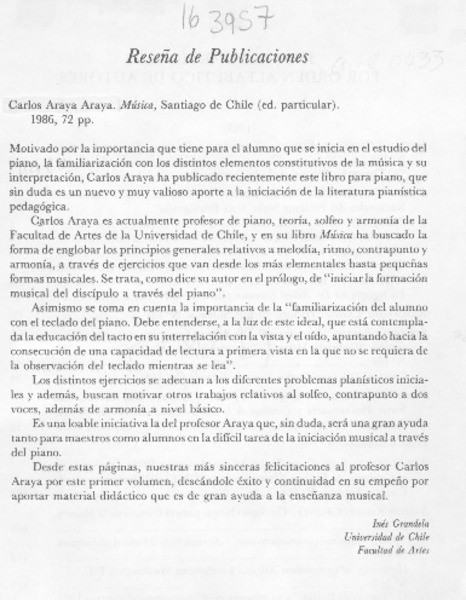 Carlos Araya Araya, "Música" [artículo] Inés Grandela.