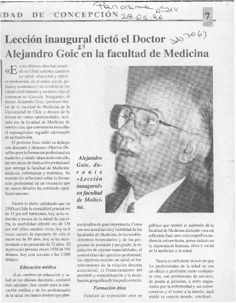 Lección inaugural dictó el Doctor Alejandro Goic en la falcultad de medicina [artículo].