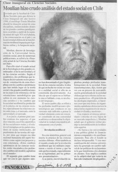 Moulian hizo crudo análisis del estado social en Chile [artículo].