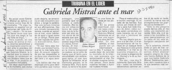 Gabriela Mistral ante el mar [artículo] Jaime Miguel Gómez Rogers.