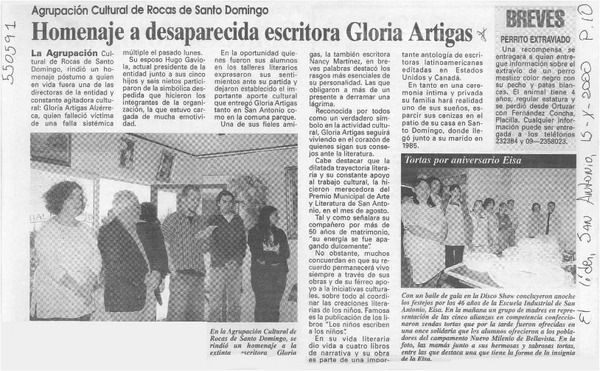 Homenaje a desaparecida escritora Gloria Artigas [artículo]