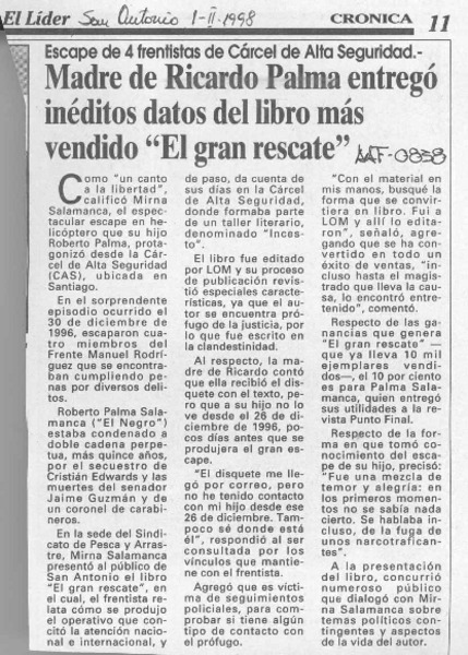 Madre de Ricardo Palma entregó inéditos datos del libro más vendido "El gran rescate" [artículo].