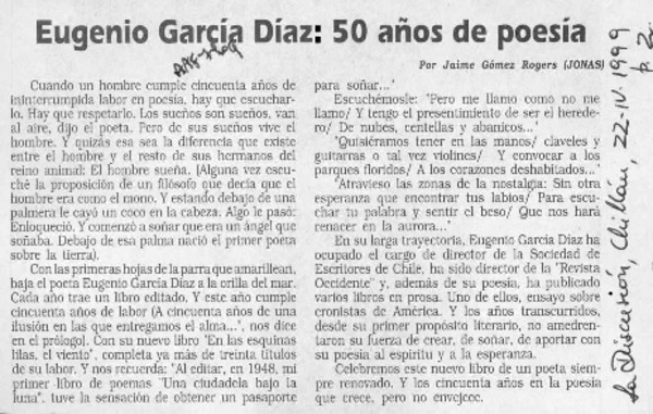Eugenio García Díaz, cincuenta años de poesía [artículo] Jaime Miguel Gómez Rogers.