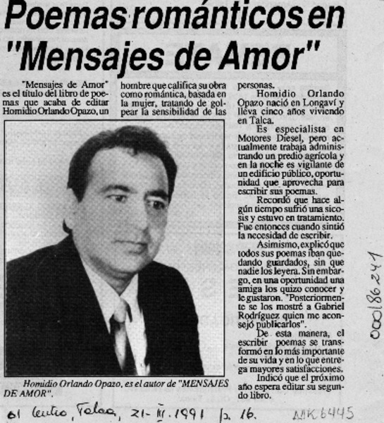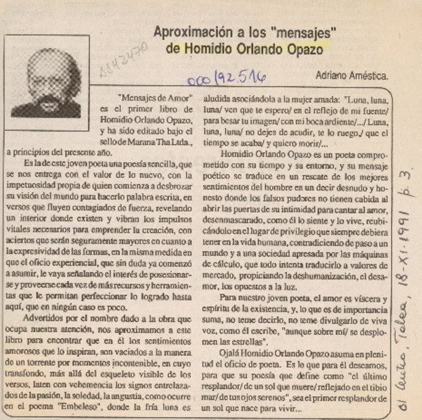 Aproximación a los "mensajes" de Homidio Orlando Opazo [artículo] Adriano Améstica.