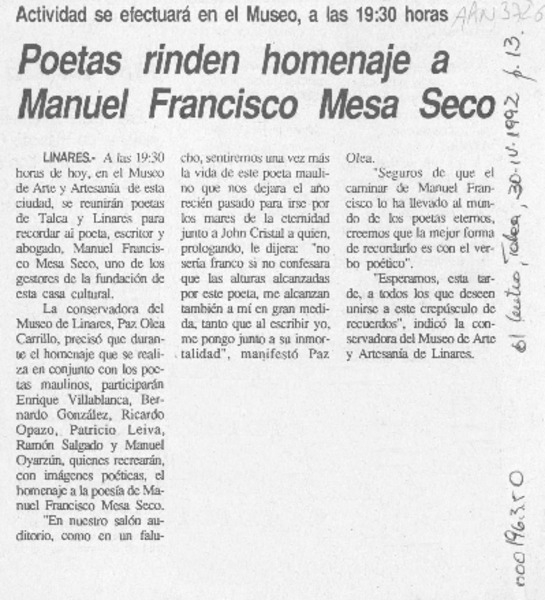 Traen a la provincia restos del poeta Max Jara [artículo].