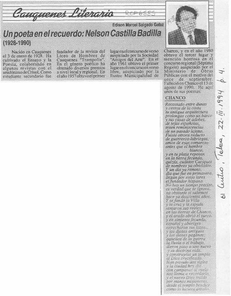 Un poeta en el recuerdo, Nelson Castilla Badilla (1928-1990) [artículo] Edison Marcel Salgado Galaz.