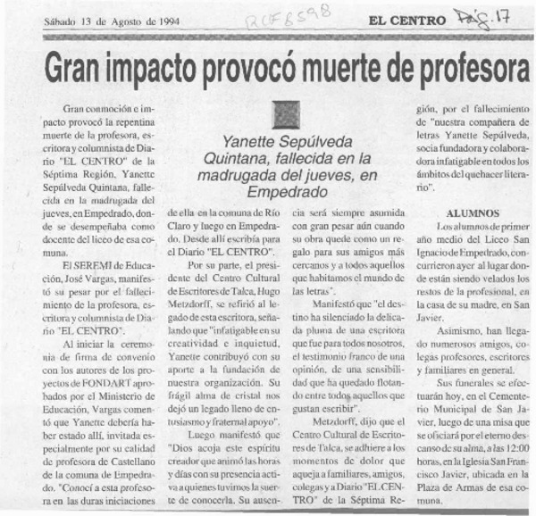 Abandonada tumba de madre de Neruda, 23 años de la muerte de Violeta Parra [artículo] Orlando Gutiérrez Salinas.