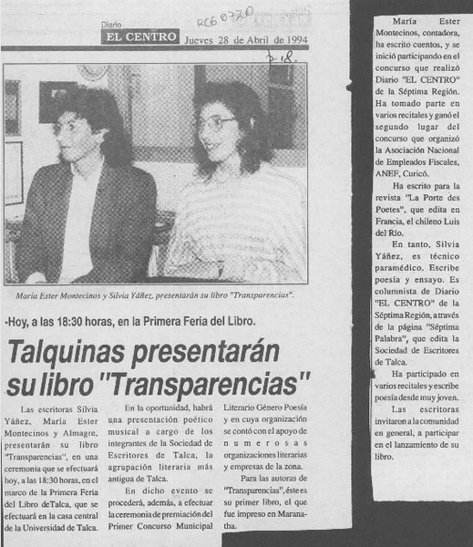 Talquinas presentarán su libro "Transparencias" [artículo].