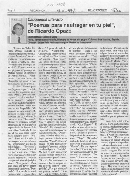 Algo sobre Ricardo Opazo, "Poemas para naufragar en tu piel" [artículo] Bernardo González Koppmann.
