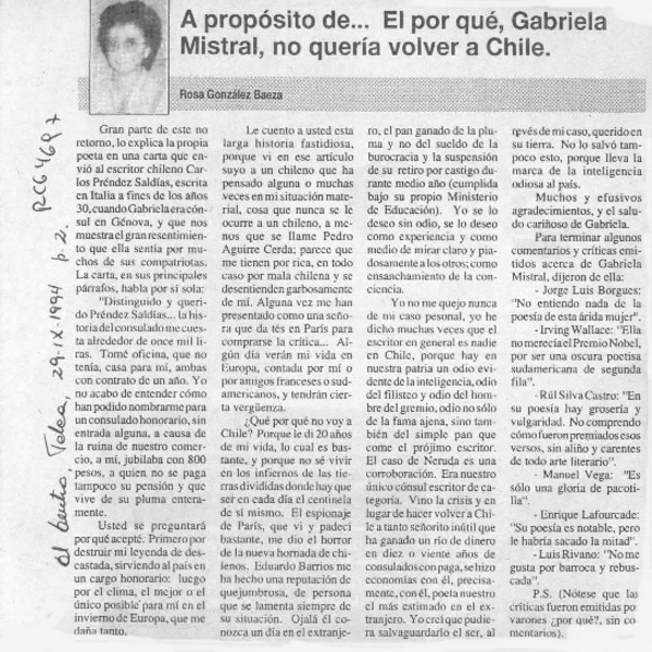 A propósito de -- el por qué Gabriela Mistral no quería volver a Chile [artículo] Rosa González Baeza.