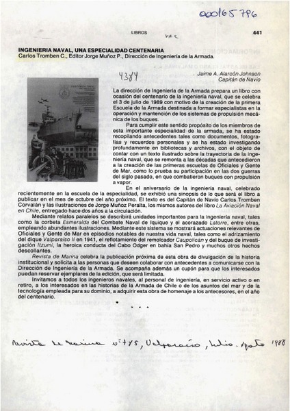 Ingenieria naval, una especialidad centenaria [artículo] Jaime A. Alarcón Johnson.