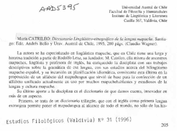 Diccionario lingüístico-etnográfico de la lengua mapuche [artículo] Claudio Wagner.