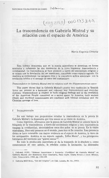 La trascendencia en Gabriela Mistral y su relación con el espacio de América [artículo] María Eugenia Urrutia.