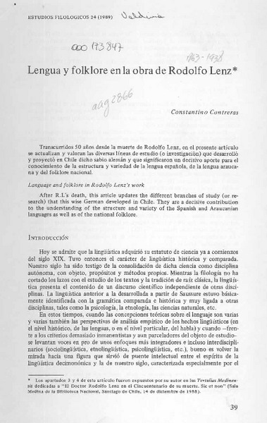 Lengua y folklore en la obra de Rodolfo Lenz [artículo] Constantino Contreras.