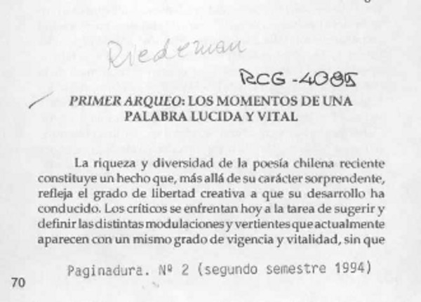 Primer arqueo, los momentos de una palabra lúcida y vital [artículo] David Miralles.