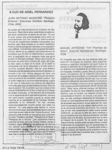 Autores chilenos - Arteche, Miguel - Massone, Juan Antonio - 101 poemas de amor - Pedazos enteros