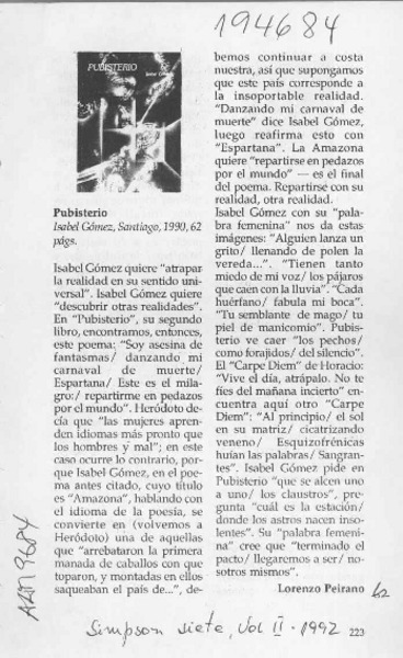 Pubisterio [artículo] Lorenzo Peirano.