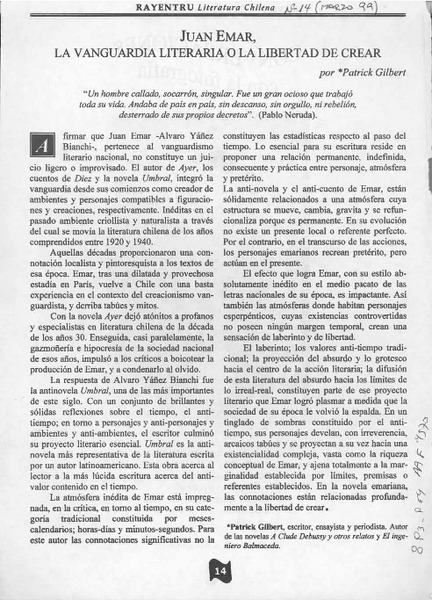 Juan Emar, la vanguardia literaria o la libertad de crear [artículo] Patrick Gilbert.