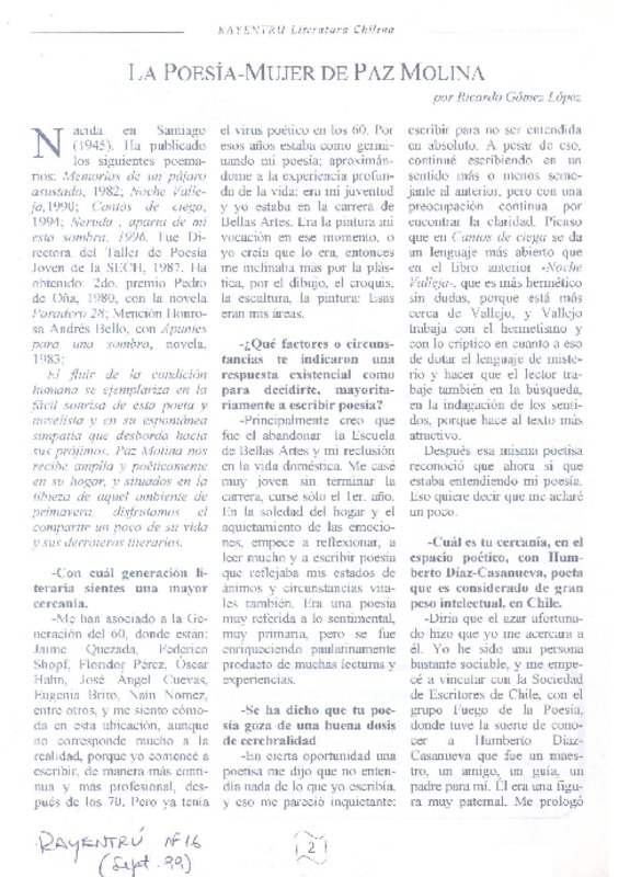 La poesía-mujer de Paz Molina [artículo] Ricardo Gómez López