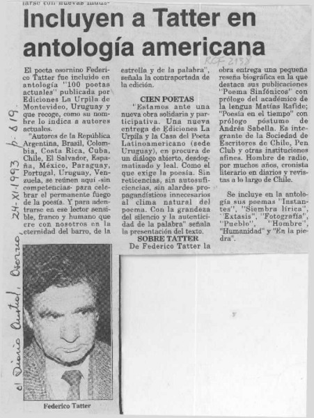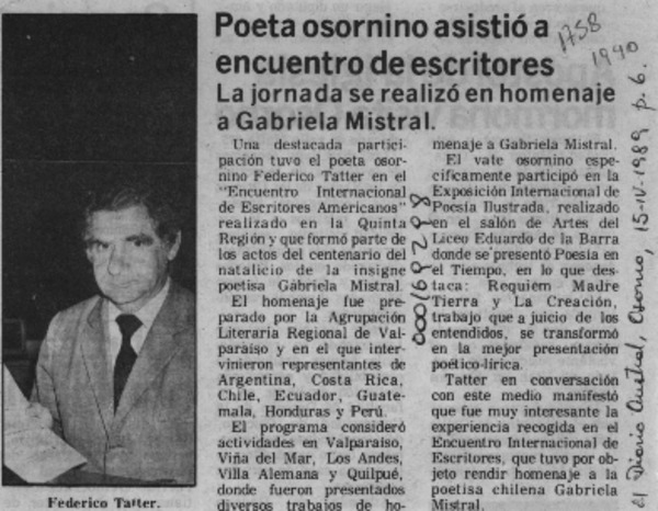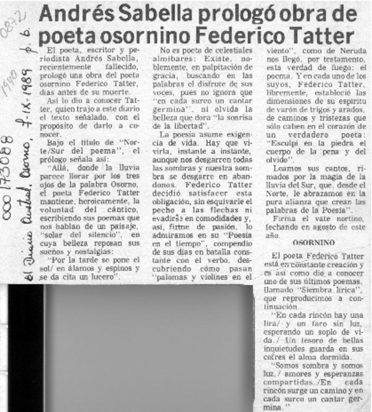 Andrés Sabella prologó obra de poeta osornino Federico Tatter [artículo].