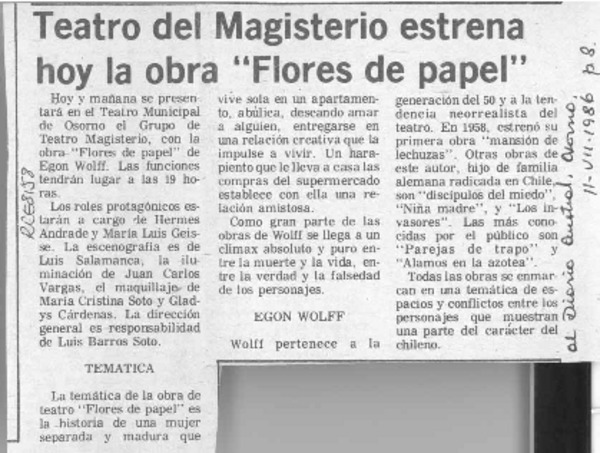 Teatro del magisterio estrena hoy la obra "Flores de papel" [artículo].