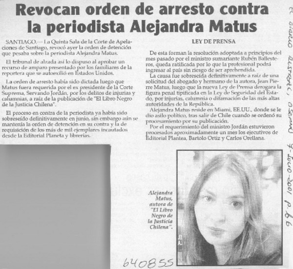 Revocan orden de arresto contra la periodista Alejandra Matus [artículo]