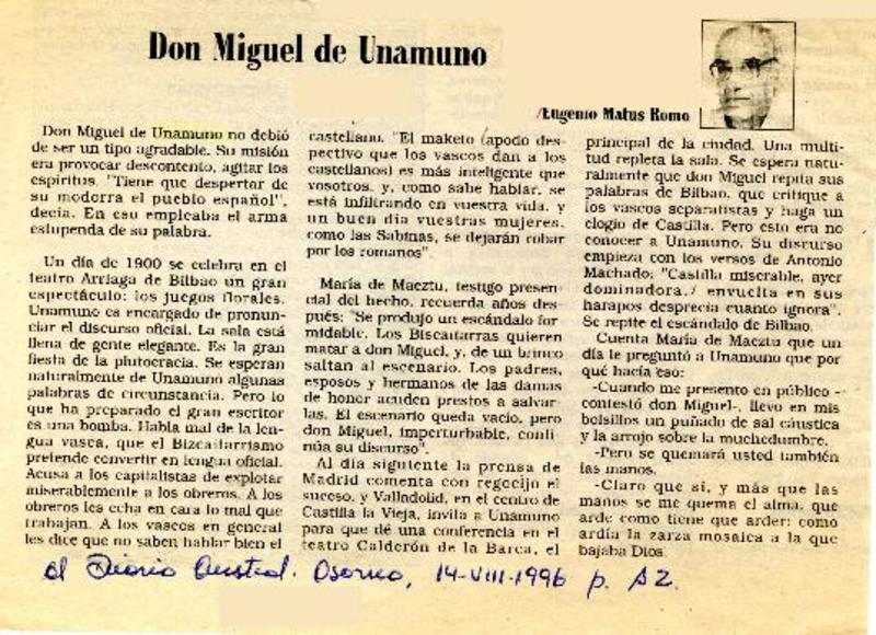 Don Miguel de Unamuno [artículo] Eugenio Matus Romo.