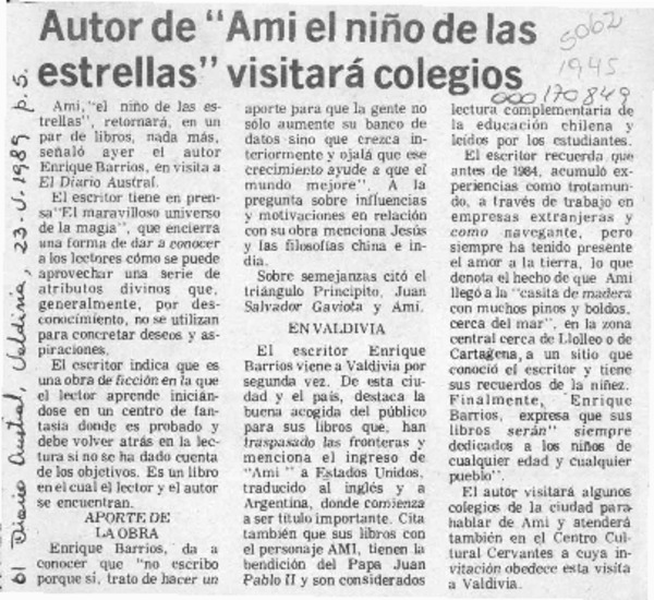 Autor de "Ami el niño de las estrellas" visitará colegios [artículo].