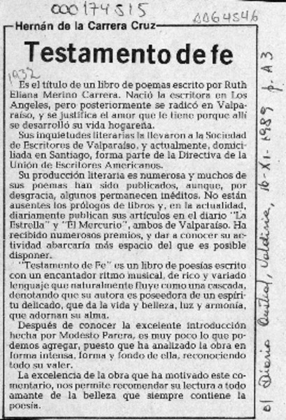 Testamento de fe [artículo] Hernán de la Carrera Cruz.