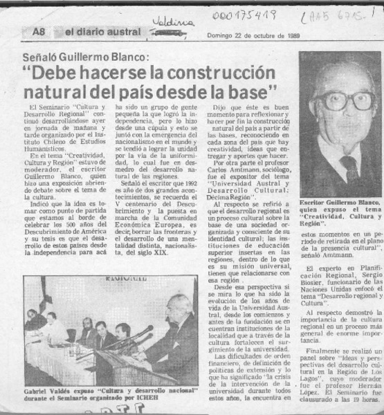 Señaló Guillermo Blanco, "Debe hacerse la construcción natural del país desde la base" [artículo].