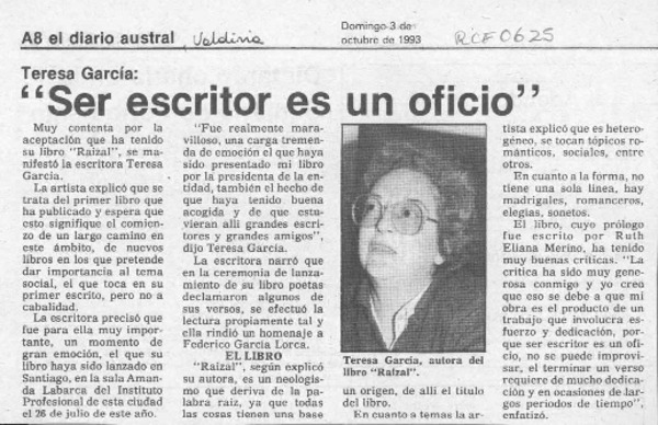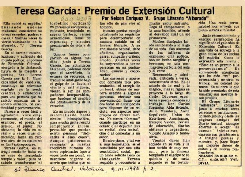 Teresa García, Premio de Extensión Cultural [artículo] Nelson Enríquez V.