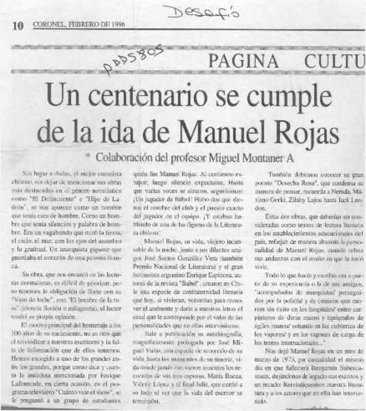 Un Centenario se cumple de la ida de Manuel Rojas [artículo].