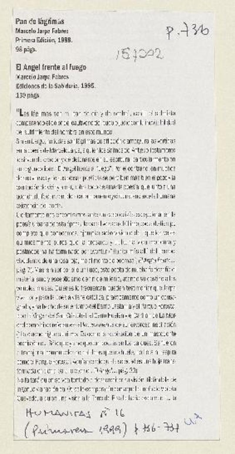 JARPA FABRES, MARCELO - PAN DE LAGRIMAS - ANGEL FRENTE AL FUEGO